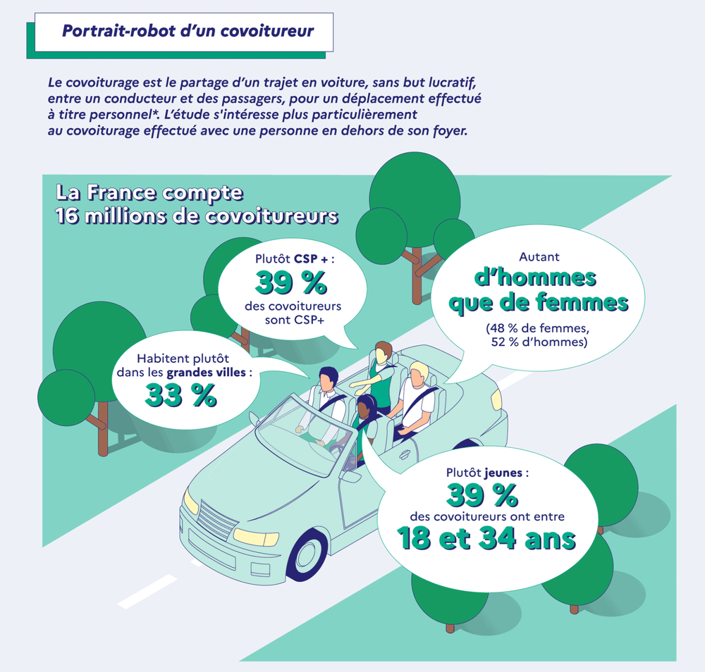 - Grand public : un échantillon représentatif de 15 000 personnes, permettant de mesurer le poids des pratiques à l’échelle nationale et de mieux comprendre les perceptions et dynamiques autour du covoiturage.